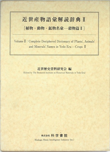 (l)世界で唯一の植物・動物・鉱物語彙の完璧な解読辞典----近世の古文書に見いだされる、日本産の植物・動物・鉱物の名称を検索できる語彙解読辞典。第1巻(あ?し)・第2巻(す?を)として、穀物の名称合計約九千種類につき解読。五十音順に配列。従来は用字辞典がほとんどであったが、植物・動物・鉱物語彙の解読辞典として、世界で最初に刊行。日本に産する植物・動物・鉱物の語彙を完璧に網羅。