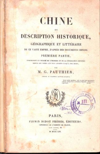 PAUTHIER, M. G. Chine ou description historique, geographie et litteraire de ce vast empire, d'apres des documents chinois 1853. Paris. 1 volume. 495 pages. 72 illustrations.