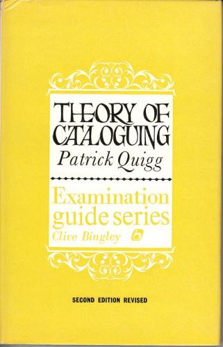 QUIGG, Patrick Theory of Cataloguing An Examination Guidebook 1941. 2nd edition revised. London : Clive Bingley. 1 volume. xxxii, 412 pages. no illustrations. 8vo (220x150).