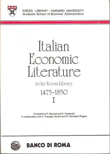 Italian Economic Literatures in the Kress Library 1475-1850 1985. first edition. Roma: Banco di Roma. 2 volumes. I: XXII, 230 pages, (4), II: (6), 231-490 pages, (2). no illustration. 8vo (165x230)." Kress Library - Harvard University Graduate School of Business Administration.publisher's original paper covers.